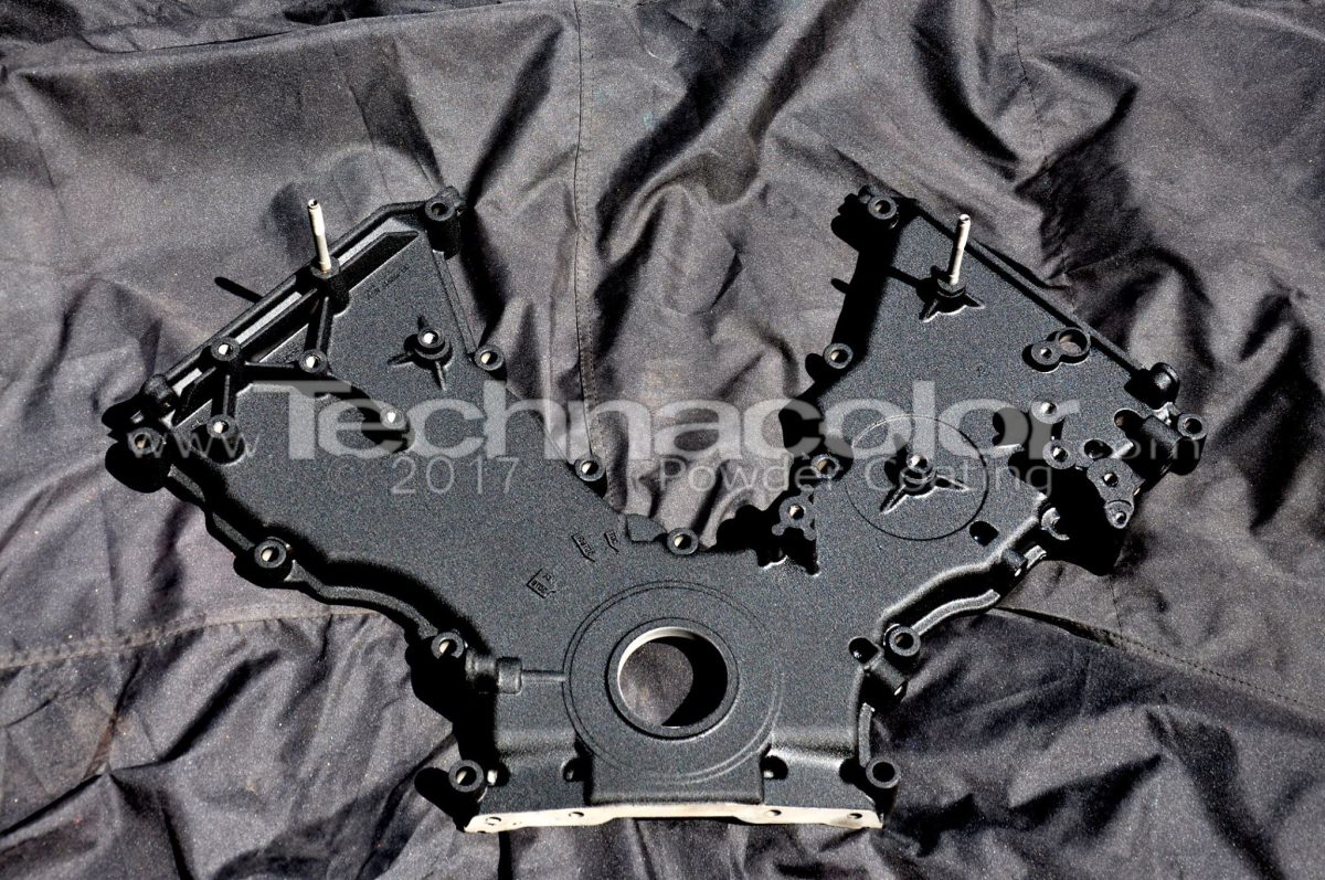Ford timing cover coated in Wrinkle Black