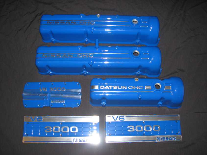 Misc Nissan and Datsun parts in mirror blue with polished lettering and clear powder