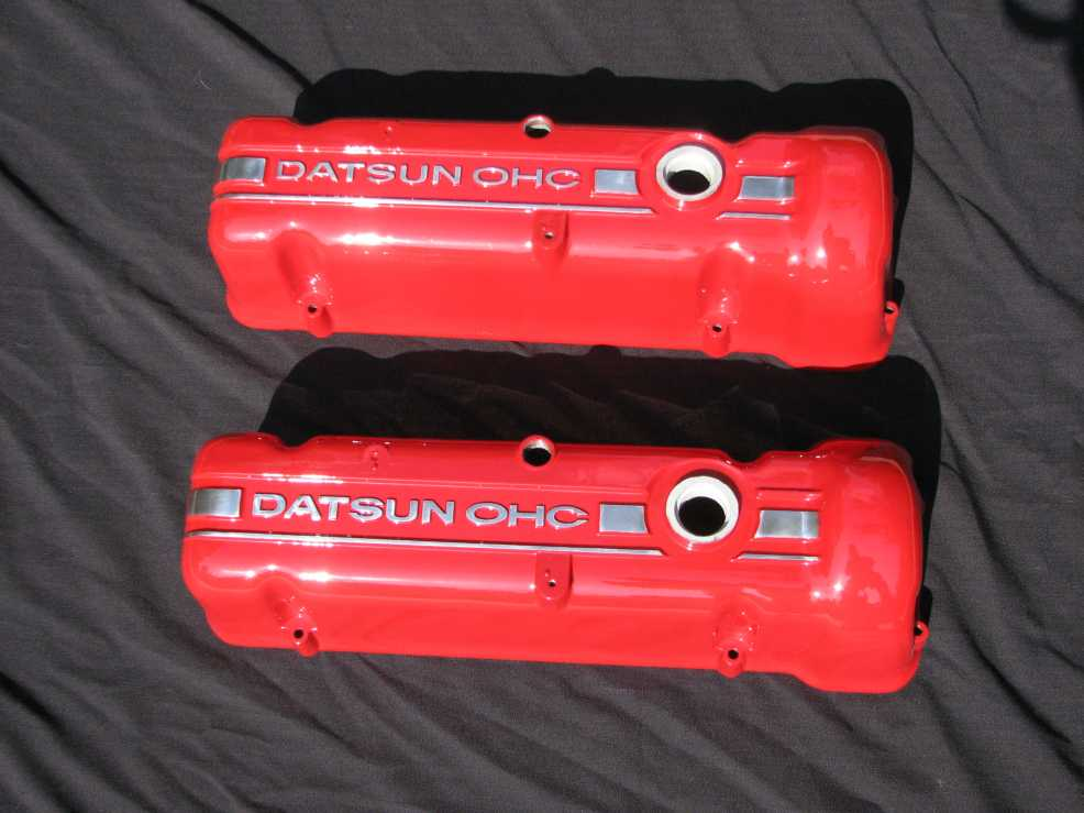 Datsun L16 and L18 valve covers in mirror black with polished lettering and clear powder